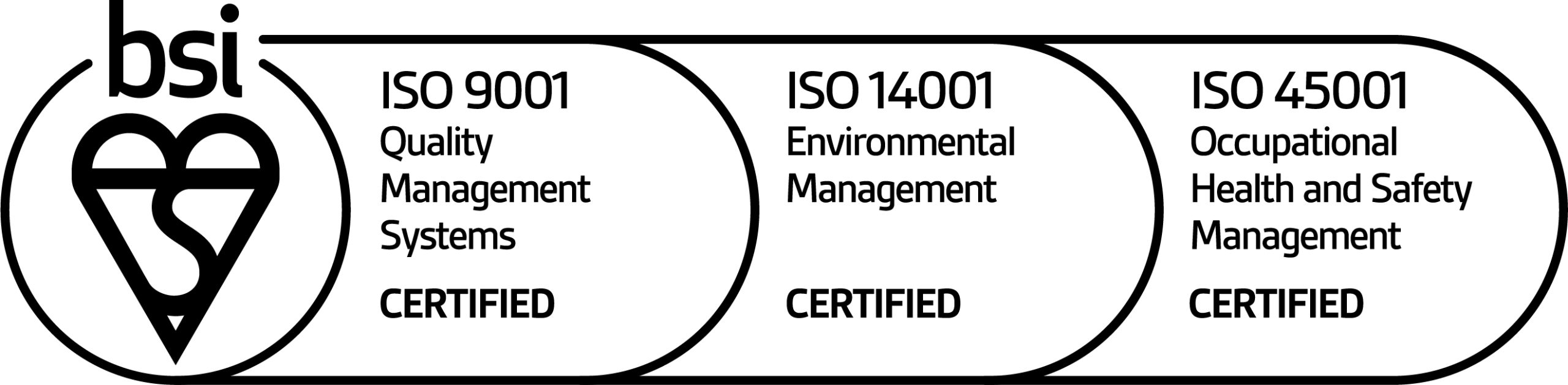 We operate a fully accredited Integrated Management System certified to ISO 9001:2015 (Quality Management), ISO 14001:2015 (Environmental Management) and ISO 45001:2018 (Occupational Health & Safety Management).
